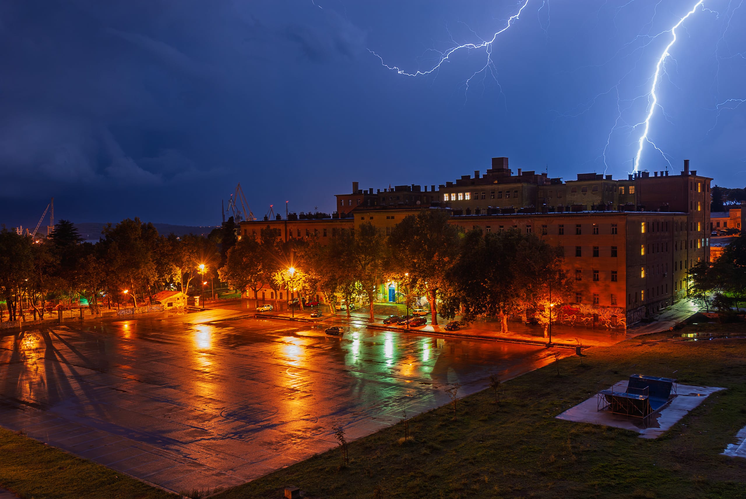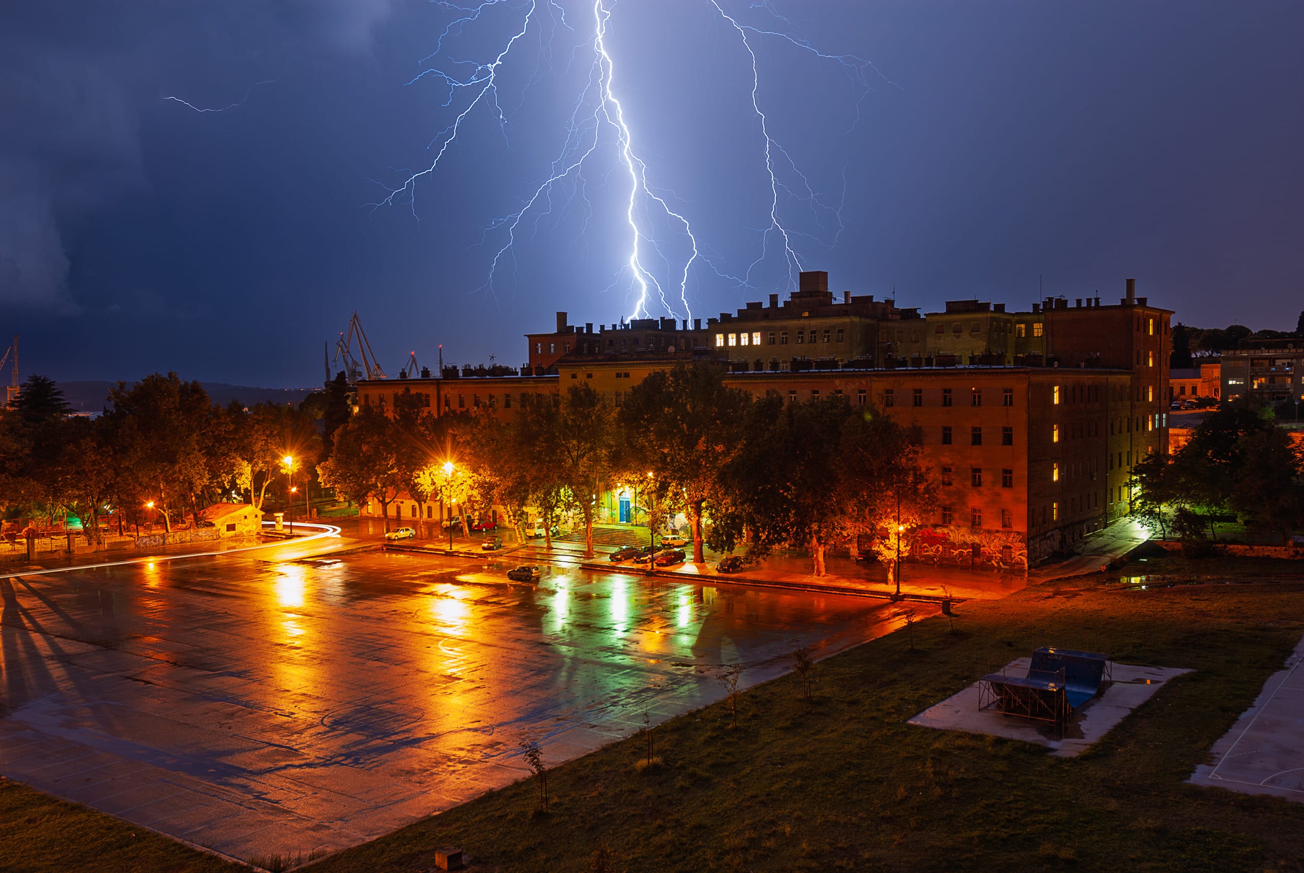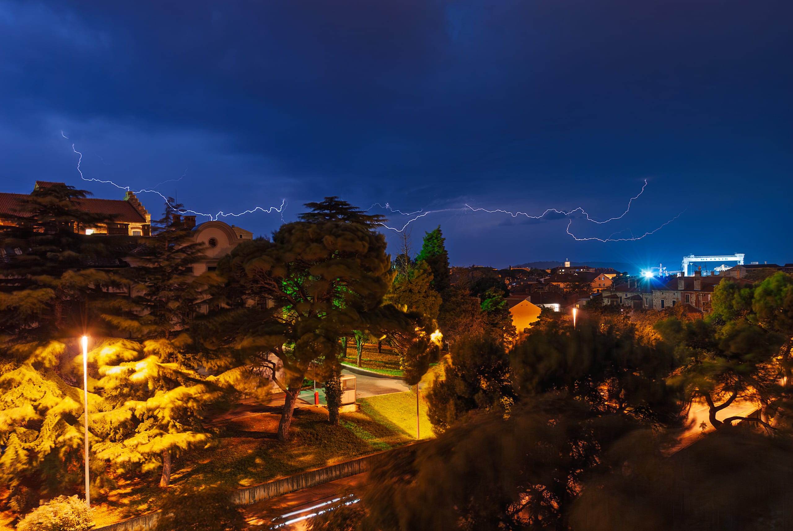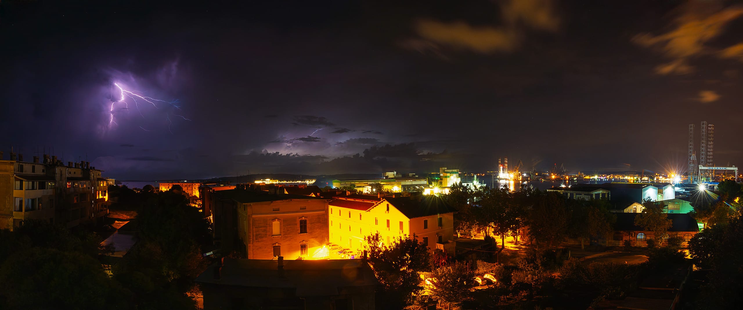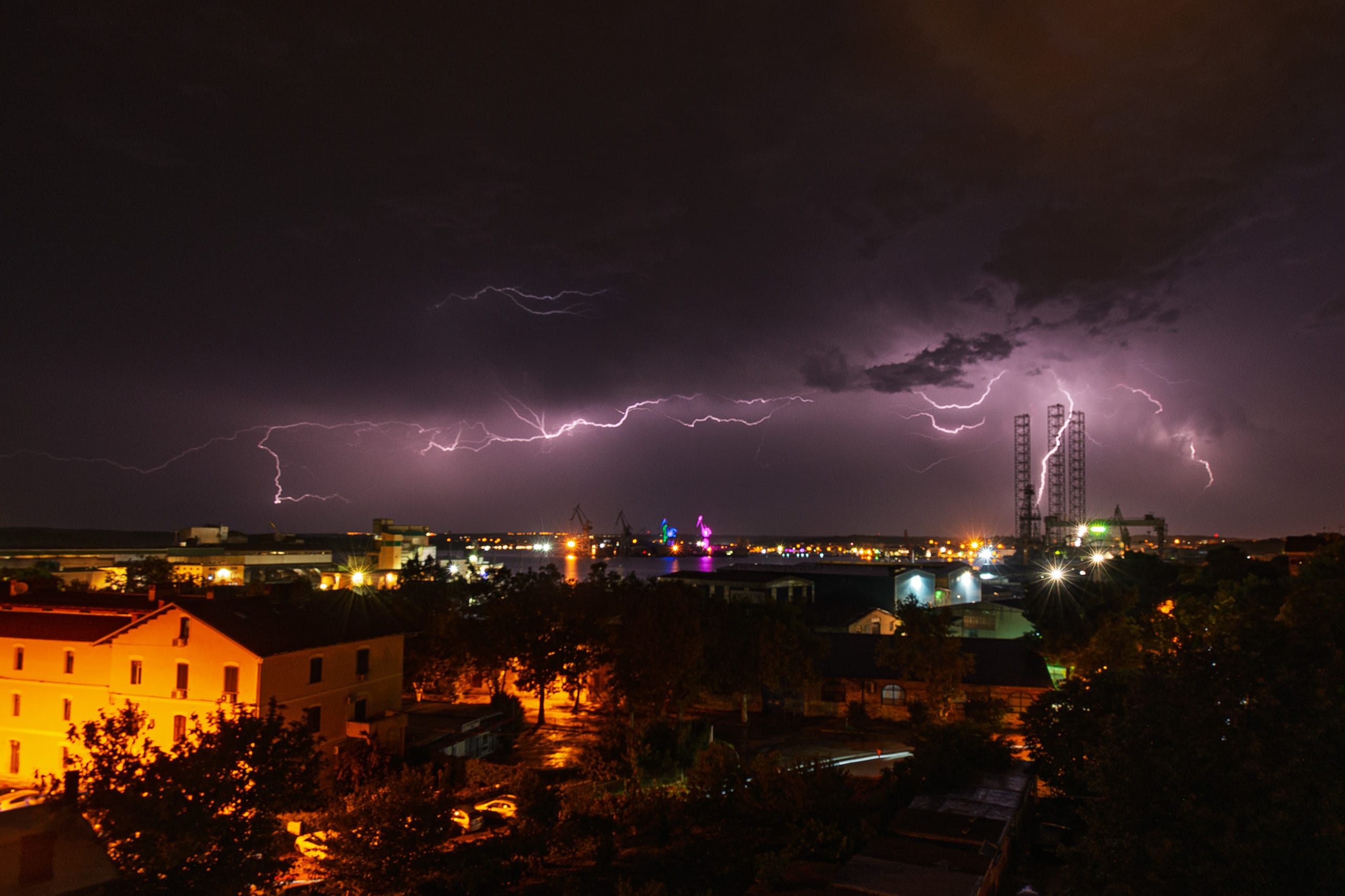 Gledaš kako se Svjetleći divovi brodogradilišta pretvaraju u mračne siluete pod paljbom nebeskog elektriciteta. To je vizualna manifestacija surove, neukrotive sile koju ponekad možeš gledati iz udobnosti doma.